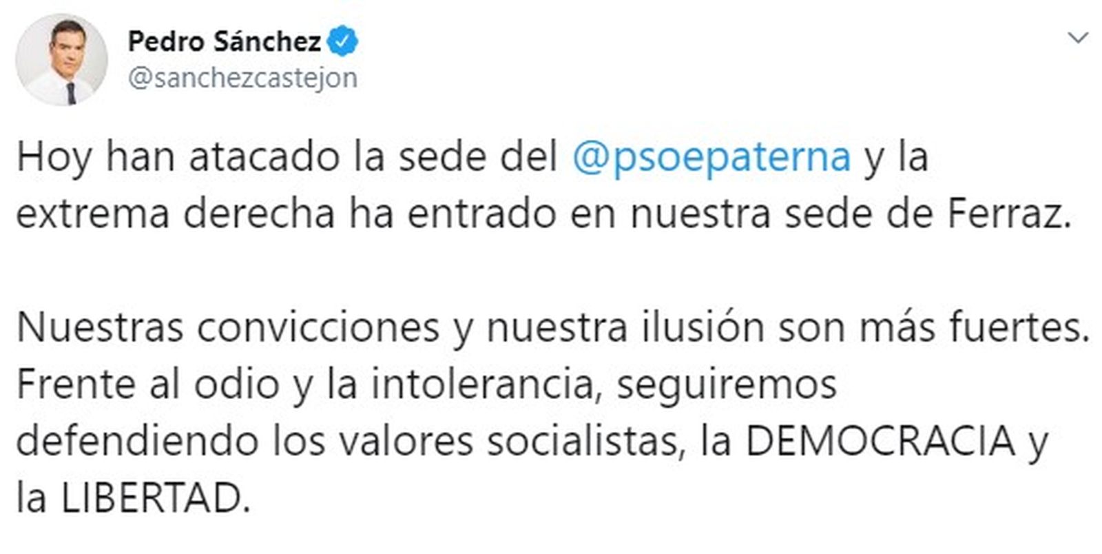 El president del govern espanyol, Pedro Sánchez, ha condemnat l’atac a la seu a través del seu compte de Twitter i ha assegurat que contra l’odi i la intolerància, continuaran defensant “els valors socialistes, la democràcia i la llibertat”.