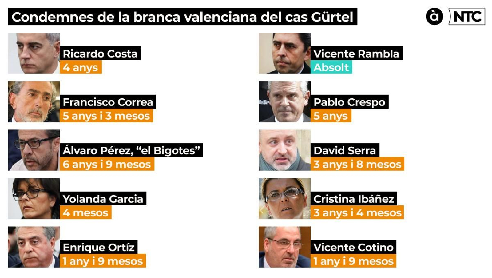 La sentència per la branca valenciana del cas Gürtel imposa penes de presó que arriben fins a 1 any i 9 mesos de presó per als 9 empresaris que van reconéixer els fets, entre els quals destaquen el constructor Enrique Ortiz, també implicat en el cas Brugal, i Vicente Cotino, nebot de l'expresident de les Corts i exconseller Juan Cotino.