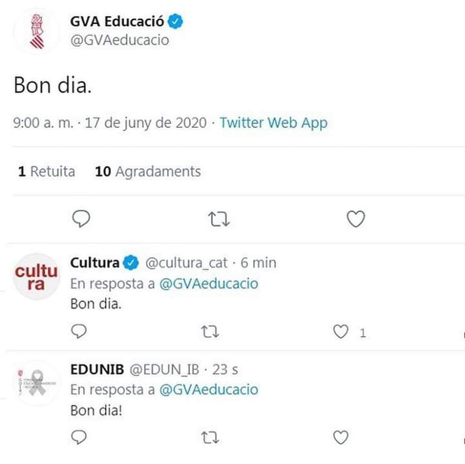 Els governs valencià, català i balear han reivindicat comunicar-se en la seua pròpia llengua amb un 'bon dia' simultani en Twitter. Amb aquest gest els tres governs autonòmics mostren el rebuig a la sentència del Suprem, segons la qual es tomba el decret de la Generalitat que prioritza la comunicació amb aquests territoris en valencià, i ordena a fer la traducció al castellà de tots els documents oficials, tot i que pertanyen al mateix àmbit lingüístic.