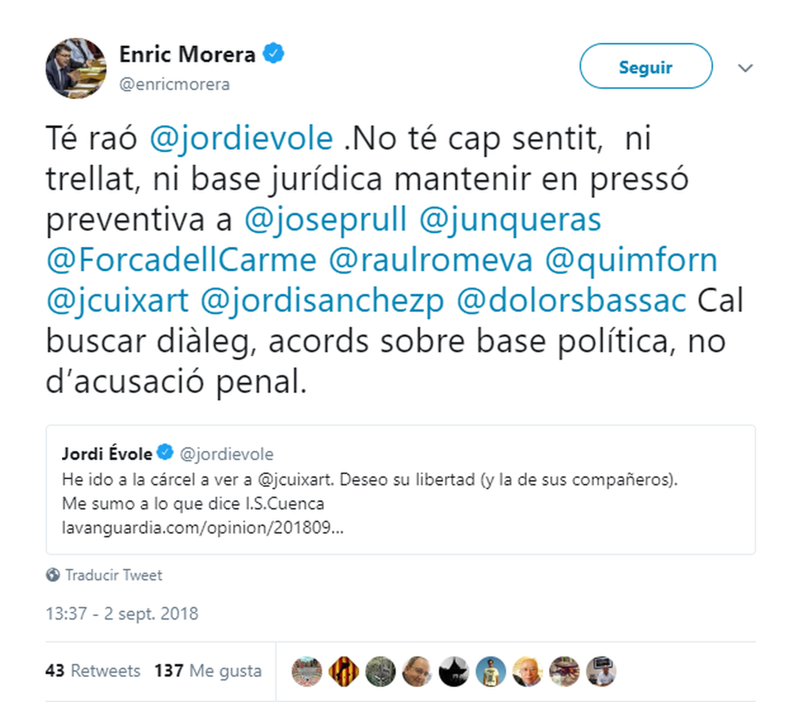 En el seu compte de Twitter, Morera ha repiulat un missatge del periodista Jordi Évole on explica que ha anat a veure a la presó a Cuixart i afig que desitja "la seua llibertat i la dels seus companys".
