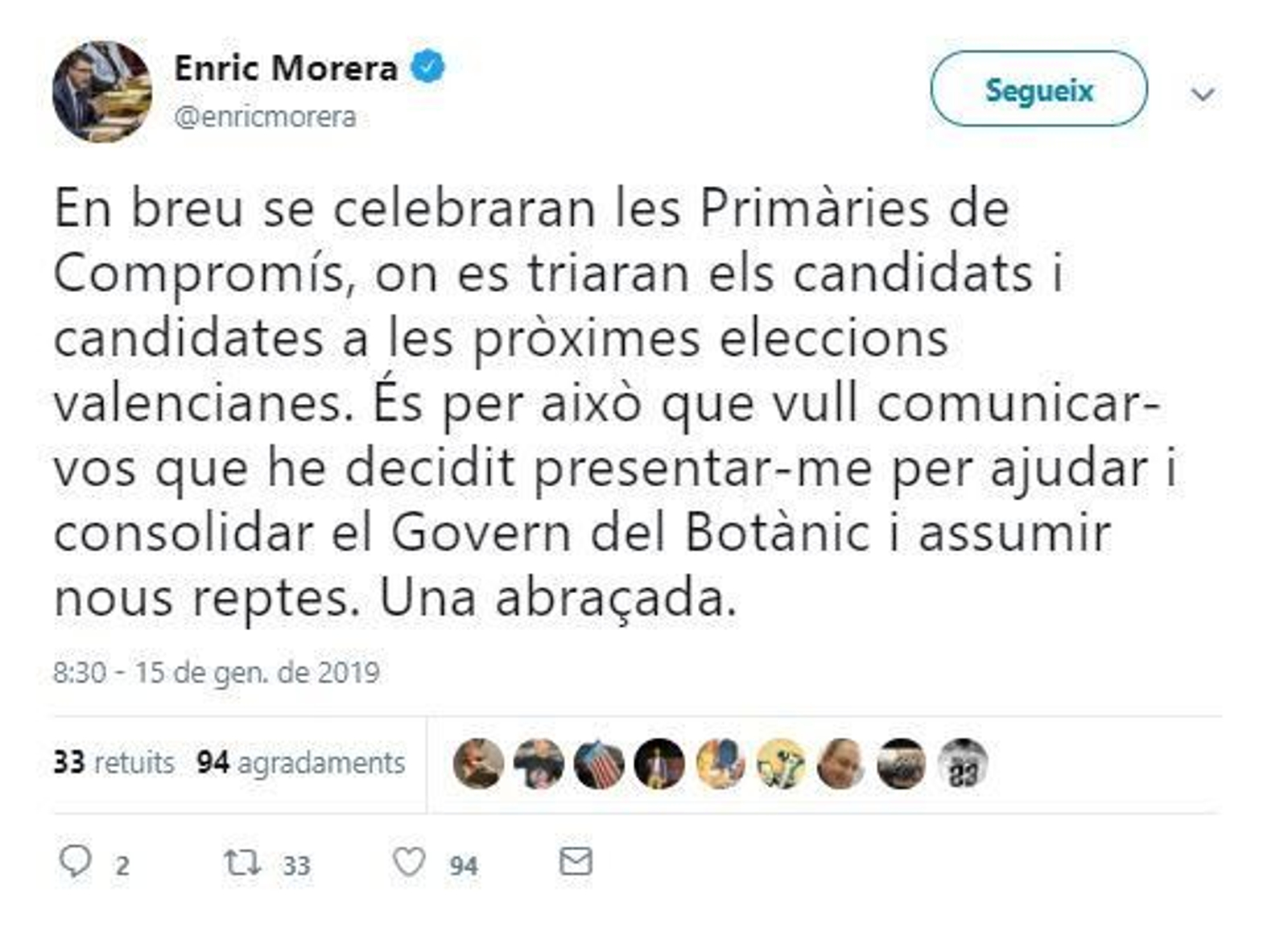 Morera ha aclarit que es presenta “per a anar en la llista” i ha avançat que “podria ser el número dos” en la candidatura. D’aquesta manera no disputaria a la vicepresidenta del Consell, Mónica Oltra, ser cap de llista.