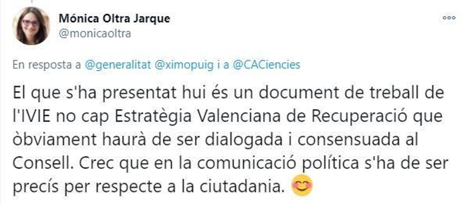 Nou episodi públic que posa de manifest la distància entre dos dels socis del govern del Botànic. La vicepresidenta del Consell, Mónica Oltra, ha publicat un missatge en Twitter en què lamenta que l'estratègia valenciana per a la recuperació, presentada aquest mateix dimarts pel president Ximo Puig en un acte a la Ciutat de les Arts i les Ciències, siga un document del Consell quan no s’ha pactat dins l'equip de govern. "El que s'ha presentat hui és un document de treball de l'IVIE no cap estratègia valenciana de recuperació que òbviament haurà de ser dialogada i consensuada al Consell. Crec que en la comunicació política s'ha de ser precís per respecte a la ciutadania", ha remarcat Oltra en la xarxa social.