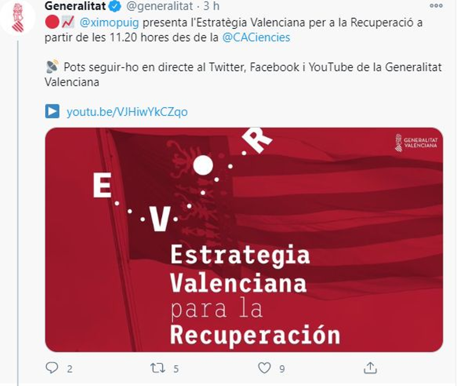 Tuit de la Generalitat al que reacciona Oltra