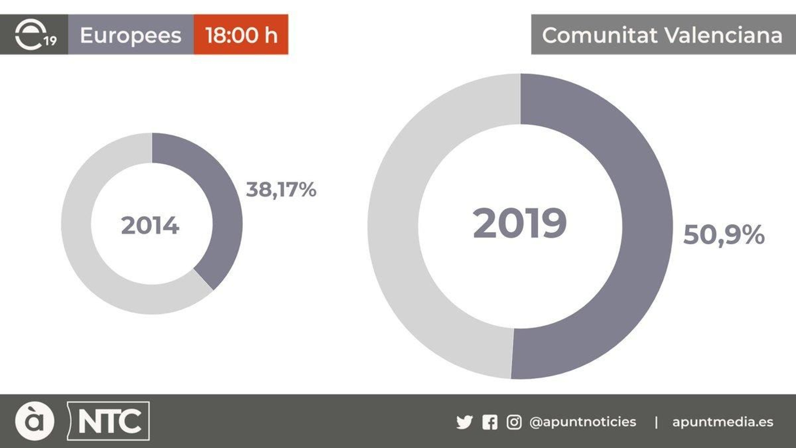 La coincidència de les eleccions municipals amb les europees ha arrossegat un creixement del vot comunitari. De fet, a la Comunitat Valenciana, la participació per a les europees s'ha situat a les 18:00 hores en el 51,04%, 12,87 punts per damunt del còmput en 2014. Aquest creixement és, en qualsevol cas, inferior al registrat a tot Espanya, on la participació provisional és del 49,37%, percentatge que representa una millora de 15,30 punts respecte de la campanya anterior.