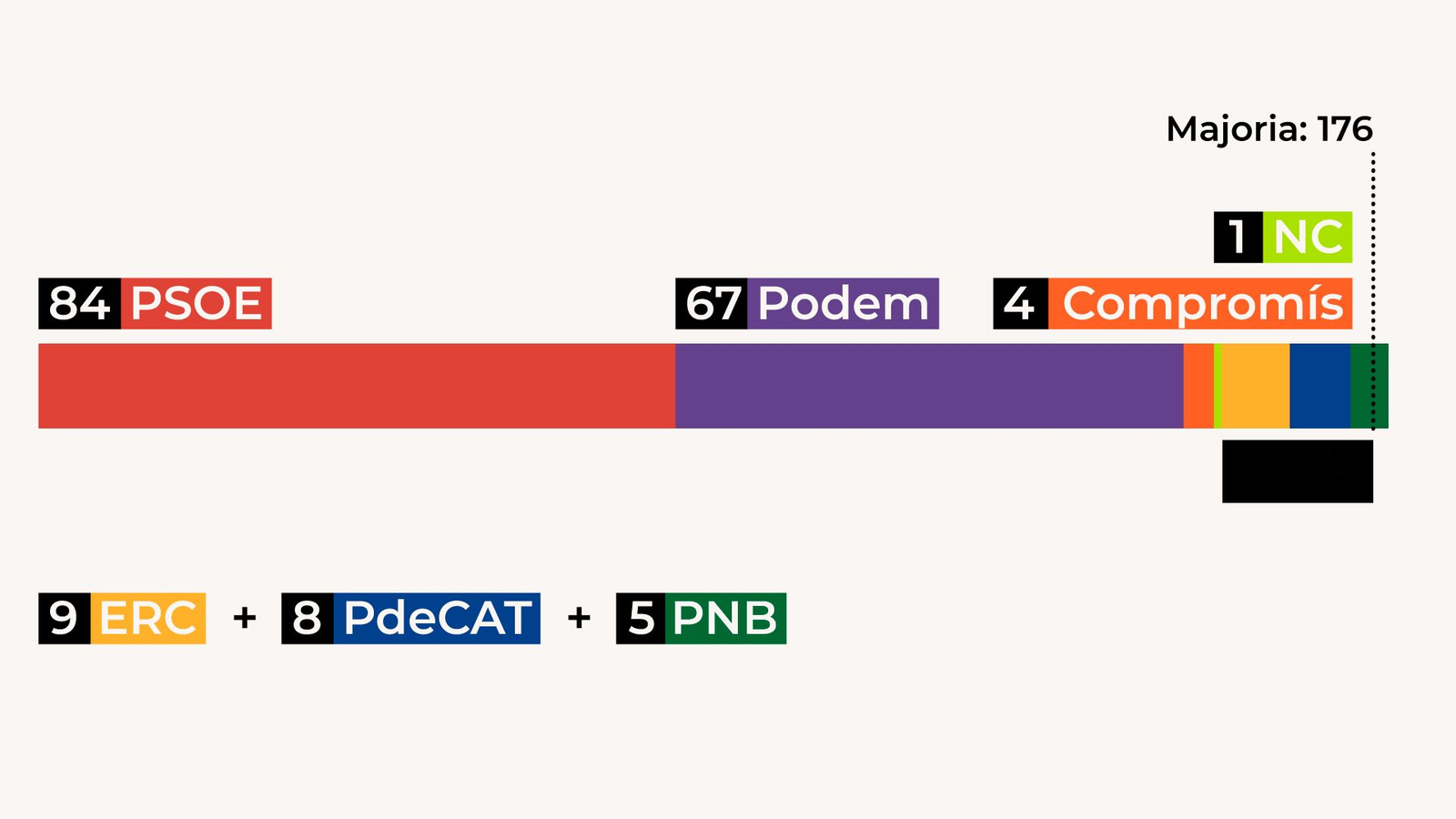 Pedro Sánchez necessita, com a mínim, els vots de la majoria absoluta de la cambra, és a dir, de 176 diputats. El PSOE disposa dels seus 84 diputats per a desallotjar el Partit Popular del Govern de l'Estat.