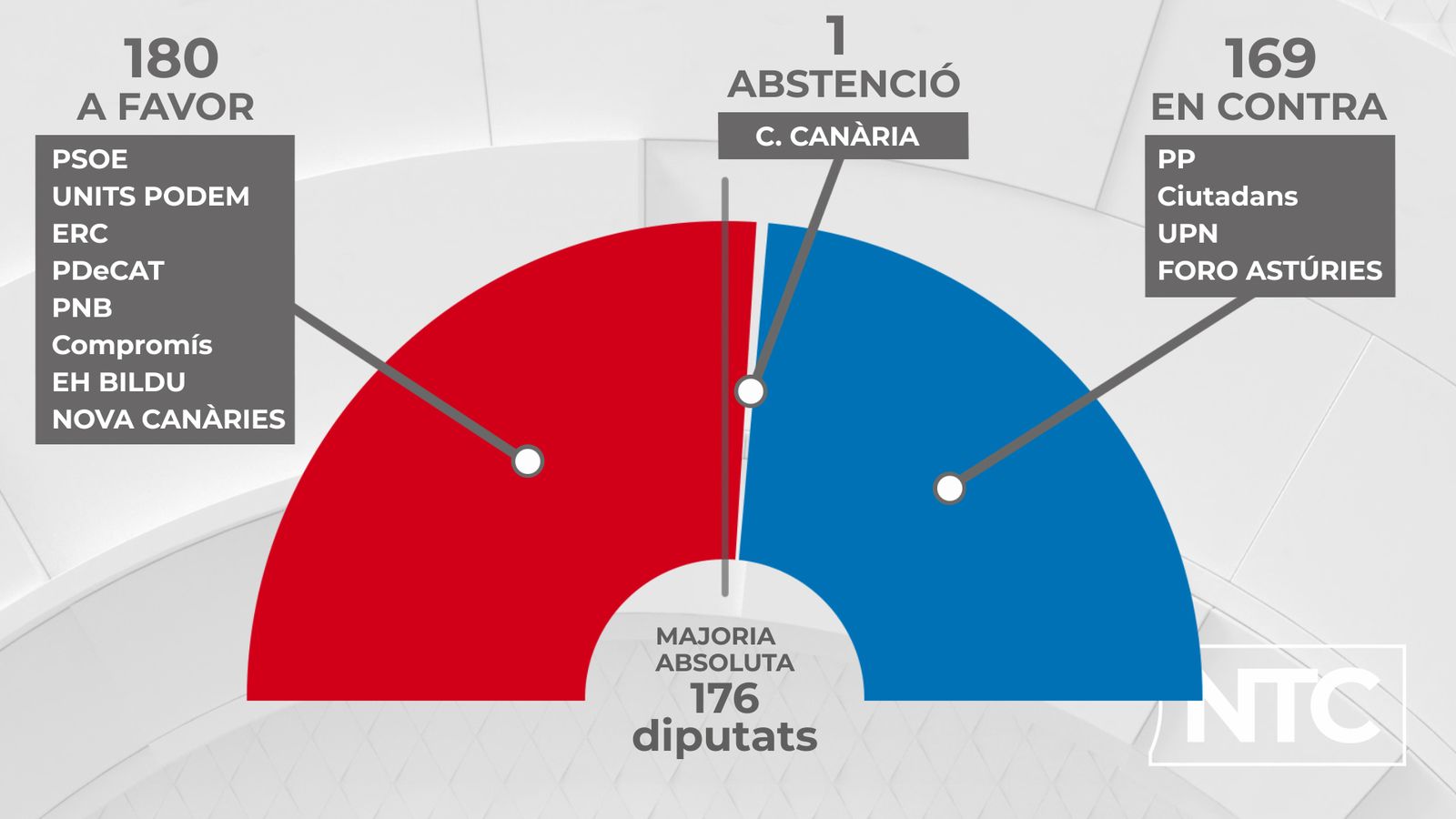 Amb 180 vots a favor, 169 en contra i una abstenció, la moció de censura presentada pel PSOE contra Mariano Rajoy ha eixit endavant i Pedro Sánchez serà el seté president del Govern espanyol de la democràcia. Els diferents grups polítics amb representació a les cambres han votat en el sentit que havien anunciat i per primera vegada el Congrés dels diputats decidix un canvi de president del Govern a través d'una moció de censura, la quarta que es presenta des que està vigent la Constitució de 1978. Les anteriors, totes rebutjades, van ser l'any 1980, presentada pel PSOE a Adolfo Suárez; l'any 1987 presentada per Alianza Popular a Felipe González; i l'any 2017 presentada per Podem a Mariano Rajoy.