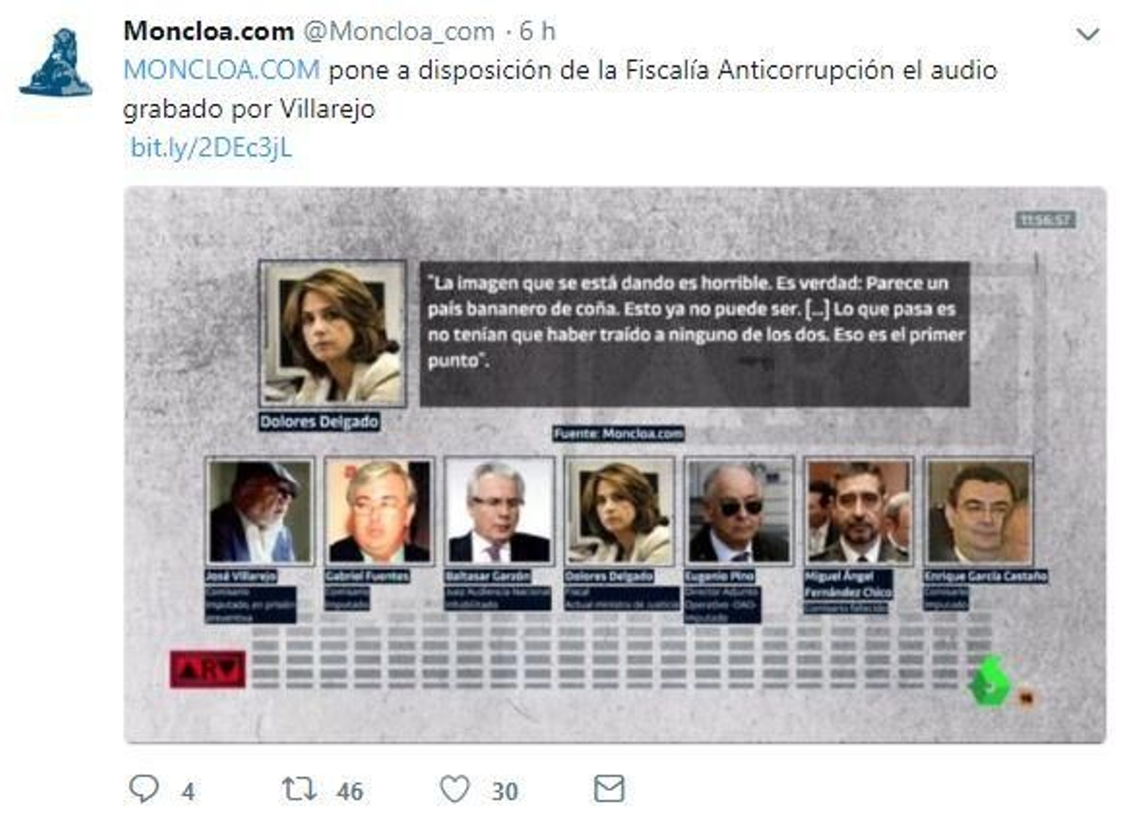 Els responsables de Moncloa.com s’han compromés a lliurar de manera immediata “el contingut íntegre” dels enregistraments del dinar al qual van assistir entre d’altres la ministra Delgado i l’excomissari Villarejo. A més, han subratllat que dijous es van posar en contacte amb la Fiscalia Anticorrupció per a oferir-los les gravacions.