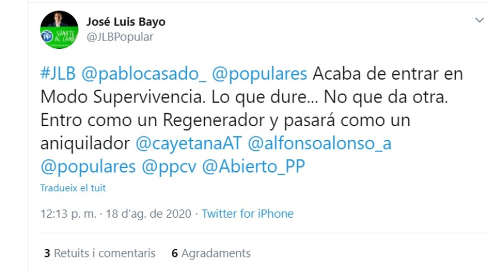 Més crític, en canvi, s’ha mostrat el precandidat a la presidència del PP José Luis Bayo: “El PP acaba d'entrar en mode supervivència. El que dure... No en queda una altra. Va entrar [Pablo Casado] com un regenerador i passarà com un aniquilador”, afirma en Twitter.