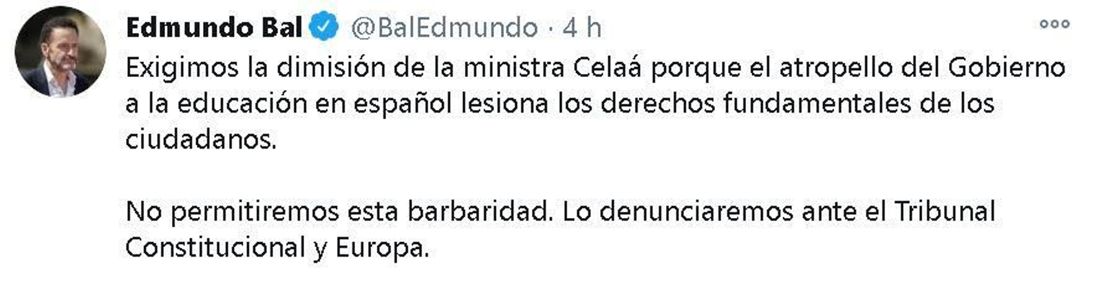 El portaveu adjunt de Ciutadans al Congrés, Edmundo Bal, ha exigit aquest divendres la dimissió de la ministra d'Educació, Isabel Celaá, per "l’atropellament" a l'educació en espanyol. Bal ha acusat la Generalitat de Catalunya d’haver incomplit de forma "sistemàtica" las sentències judicials que reconeixen el dret dels pares a educar els fills en la llengua que consideren. A més del recurs, que assegura estar preparant amb el PP, ha anticipat que portarà la qüestió als tribunals europeus.