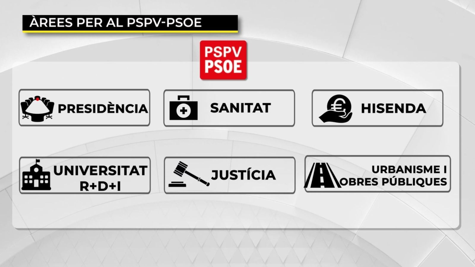 PSPV tindria, a més de la Presidència, Sanitat, Hisenda, una de nova creació com és Universitats i que incorporaria Patrimoni Cultural; Justícia i Administracions Públiques, i Urbanisme i Obres Públiques.