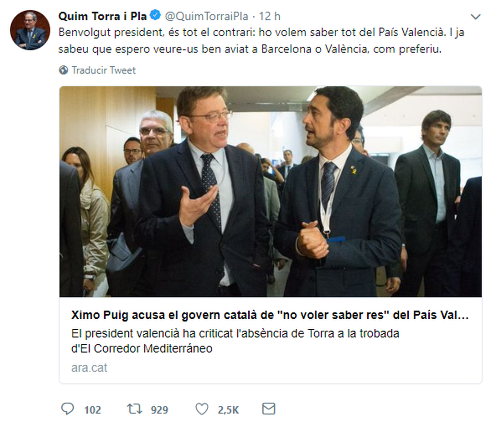Ximo Puig s'havia referit a la Generalitat de Catalunya durant un acte a Barcelona, en preguntar els periodistes per l'absència de Torra en aquest esdeveniment, la Gran Trobada pel Corredor Mediterrani, en què es van reunir empresaris i polítics que reclamen la construcció d'aquest eix ferroviari.