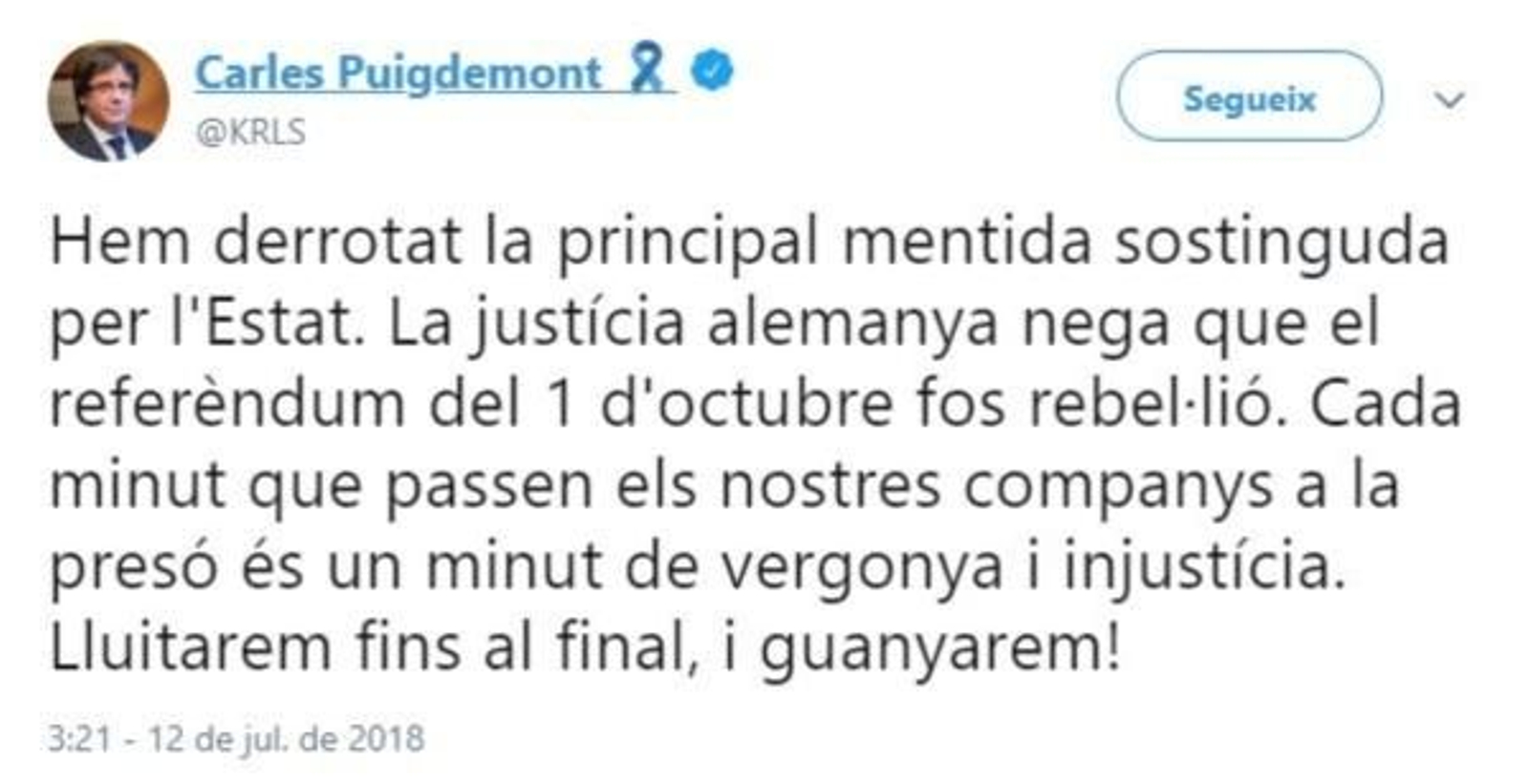 Aquest dijous 12 de juliol el tribunal superior d'Shleswig-Holstein ha anunciat que accepta extradir Puigdemont per un presumpte delicte de malversació de fons públics, descartant el de rebel·lió. Això elimina la possibilitat que puga ser jutjat per aquest últim, si més no ara per ara. Puigdemont va ser detingut a Alemanya el 25 de març de 2018 quan tornava a Bèlgica després de participar en un acte a Finlàndia, en compliment d'una euroorde emesa pel jutge del Tribunal Suprem (TS), Pablo Llarena. La defensa de Puigdemont ja ha anunciat que presentarà recurs contra la decisió i que treballarà perquè la justícia alemanya també descarte el delicte de malversació.