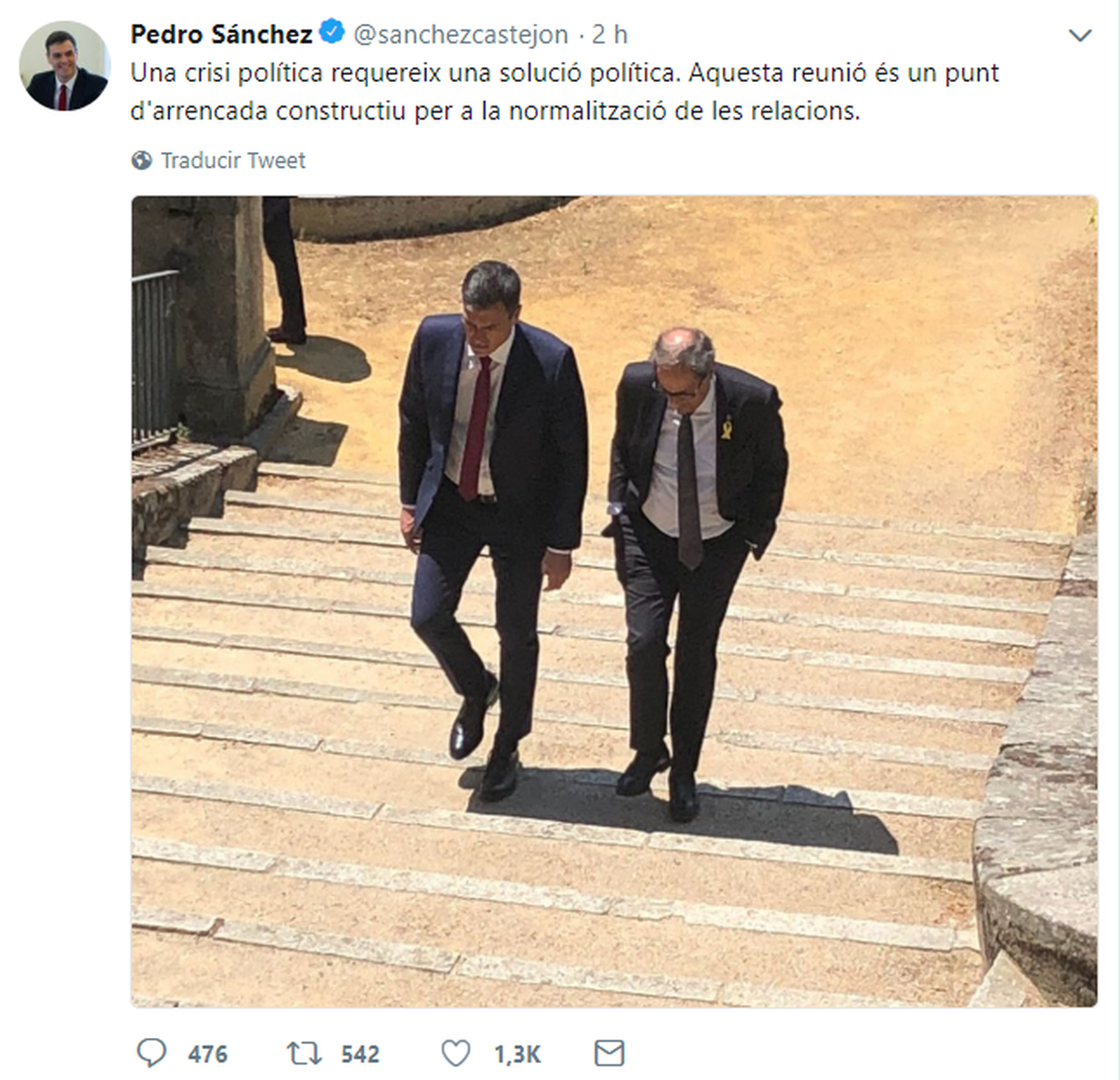 Missatge del compte de Twitter del president del govern, Pedro Sánchez, on celebra l'avanç cap a la normalitat institucional amb Catalunya.