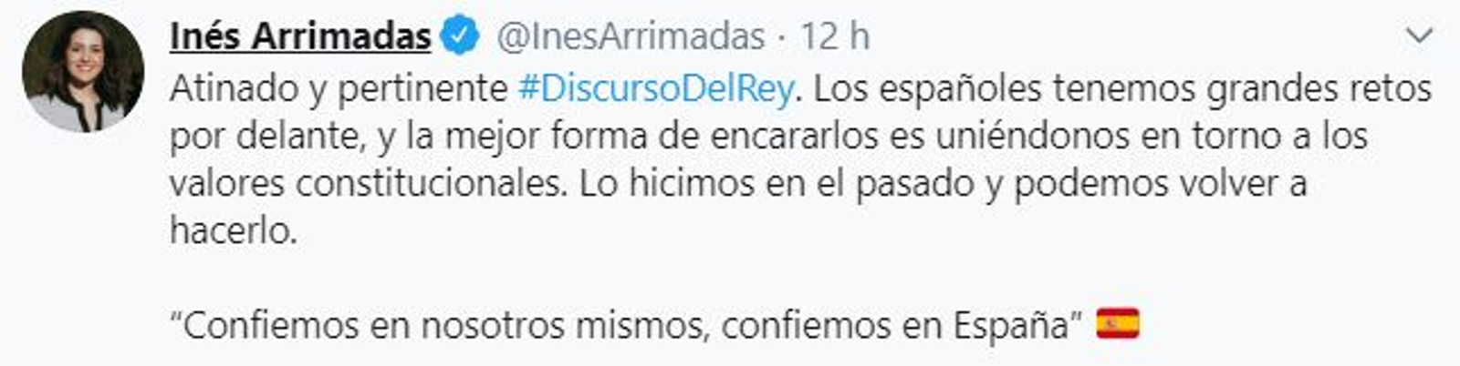D’"encertat i pertinent" ha qualificat el missatge la líder de Cs Inés Arrimadas. Coincideix amb el monarca en el fet que els espanyols tenen “grans reptes per davant, i la millor manera d’encarar-los és unint-se entorn dels valors constitucionals”.