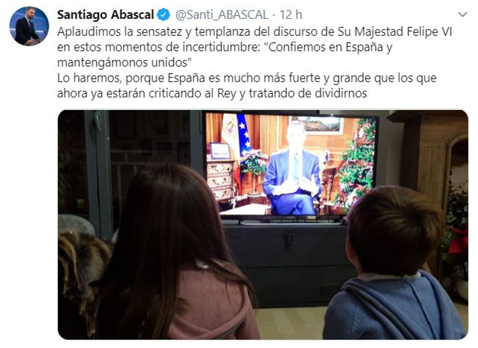 Des de l’extrema dreta, Vox ha fet una defensa encesa de l’al·locució del monarca. El líder del partit, Santiago Abascal, ha aplaudit en Twitter la “sensatesa i temprança" del discurs en general i, particularment, la crida a la unitat d’Espanya. Considera que l’Estat espanyol és “molt més fort i gran que els que ara ja estaran criticant al rei i tractant de dividir-nos”.