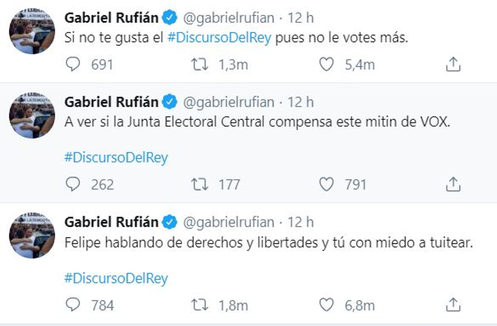 El diputat d’Esquerra Republicana de Catalunya, Gabriel Rufián, ha comparat el discurs de Felip VI amb un discurs de Vox. “A veure si la Junta Electoral Central compensa aquest míting de VOX” ha escrit Rufián en un fil de Twitter format per tres missatges i carregat d’ironia. “Felipe parlant de drets i llibertats, i tu amb por de tuitar" ha penjat en el primer tuit, per a sentenciar la seua valoració tirant novament de sarcasme amb aquest missatge final: “Si no t’agrada el #DiscursoDelRey, doncs no el votes més”.