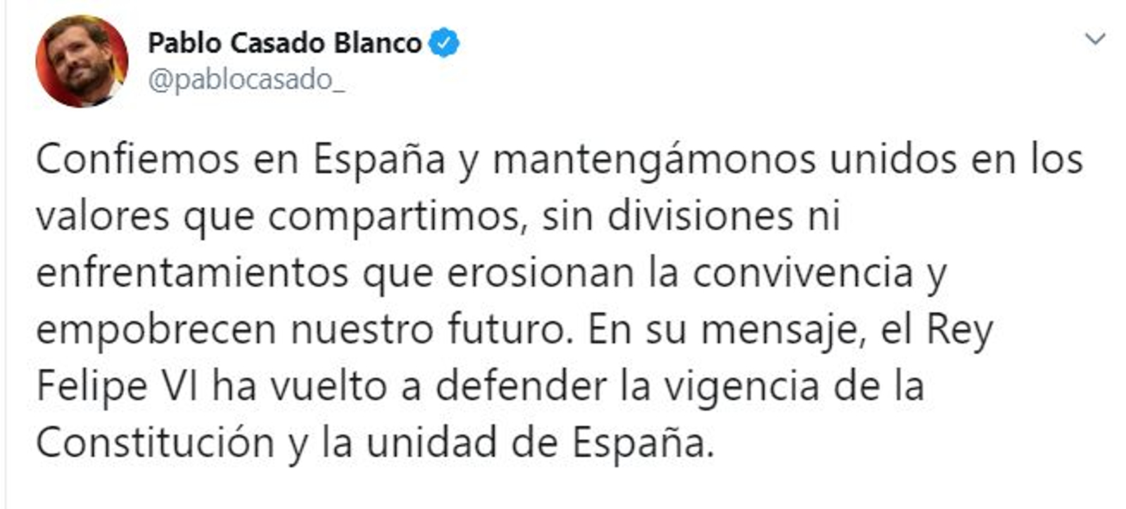 El líder del PP, Pablo Casado, ha destacat a través del seu compte en la xarxa social Twitter que el rei “ha tornat a defensar la vigència de la Constitució i la unitat d’Espanya”.