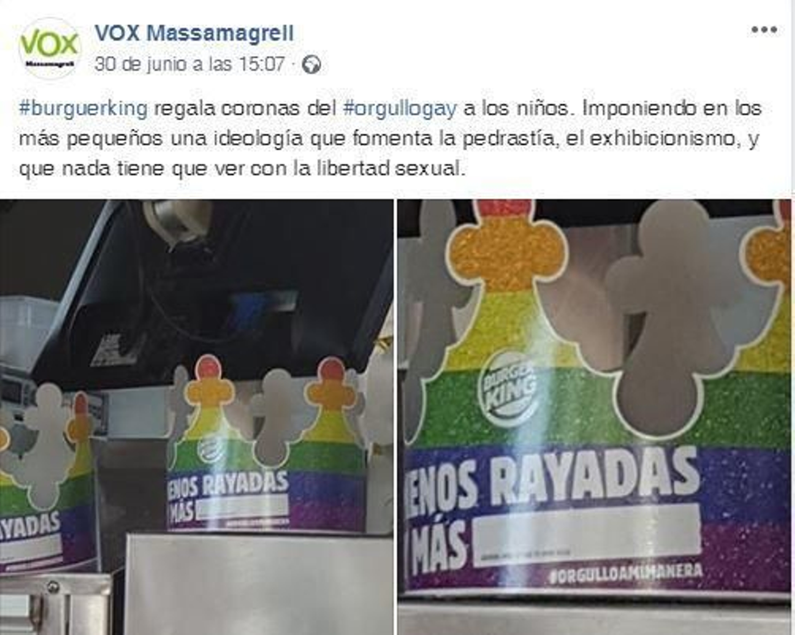 La formació d’ultradreta Vox Massamagrell ha retirat de les xarxes socials una publicació en què relacionava les celebracions de l’Orgull LGTBI amb el foment a la pederàstia. El seu únic regidor en l’Ajuntament, José Carlos Grau, va escriure diumenge una publicació en Twitter i Facebook en què assegurava que el fet que una famosa cadena de menjar ràpid regalara corones de l’Orgull als més joves suposava una imposició “d’una ideologia que fomenta la pederàstia, l’exhibicionisme i que no té res a veure amb la llibertat sexual”. Ràpidament, l’apunt va rebre una allau de crítiques per part d’usuaris, fet que ha portat Grau mateix a retirar la publicació.