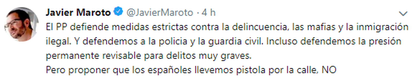El vicesecretari d'Organització del PP i cap de la campanya electoral, Javier Maroto, ha rebutjat per Twitter la proposta de Vox. Assegura Maroto que, tot i que la seua formació "defensa mesures estrictes contra la delinqüència, les màfies i la immigració il·legal", rebutja que els espanyols porten "pistola pel carrer".