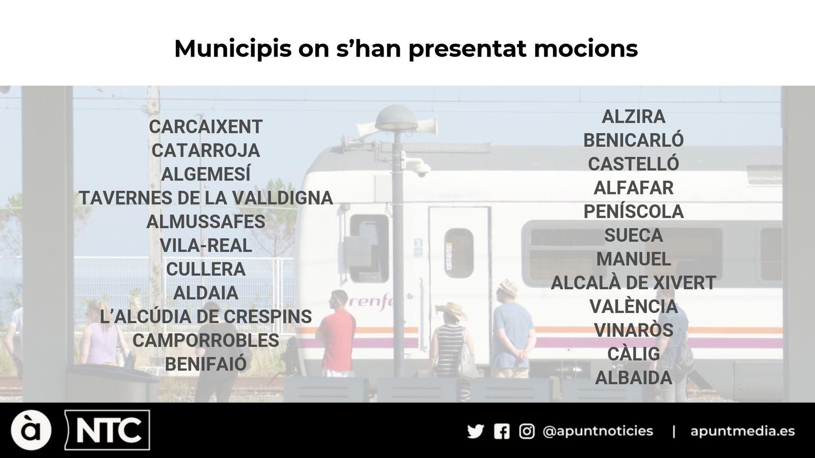 La plataforma Indignats amb Renfe ha presentat fins al dia de hui un total de 25 mocions als ajuntaments “afectats per la precarització del servei”. Carcaixent, Catarroja, Algemesí, Alfafar, Sueca, Benifaió o Albaida són algunes de les localitats on denuncien que la qualitat de la prestació continua empitjorant cada dia.