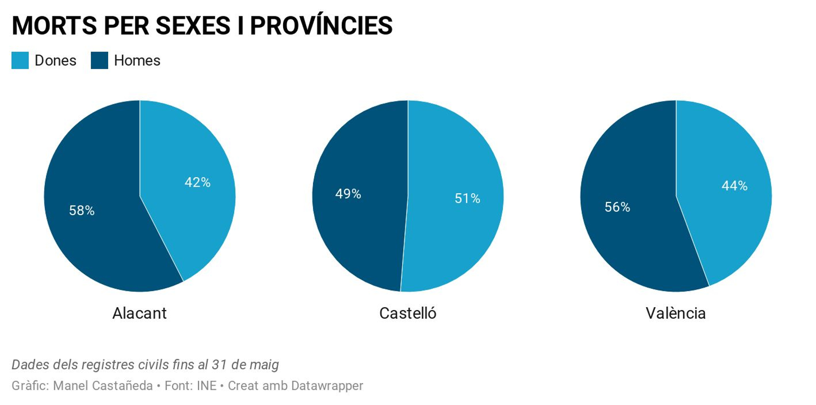 De les dades de l’institut estadístic també es desprén que en la majoria de les morts valencianes per coronavirus les víctimes han sigut homes (978 enfront de 788 dones), una tendència que es confirma també a nivell provincial amb una excepció: Castelló és l’única de les tres demarcacions del País Valencià on hi ha hagut més dones mortes que homes.