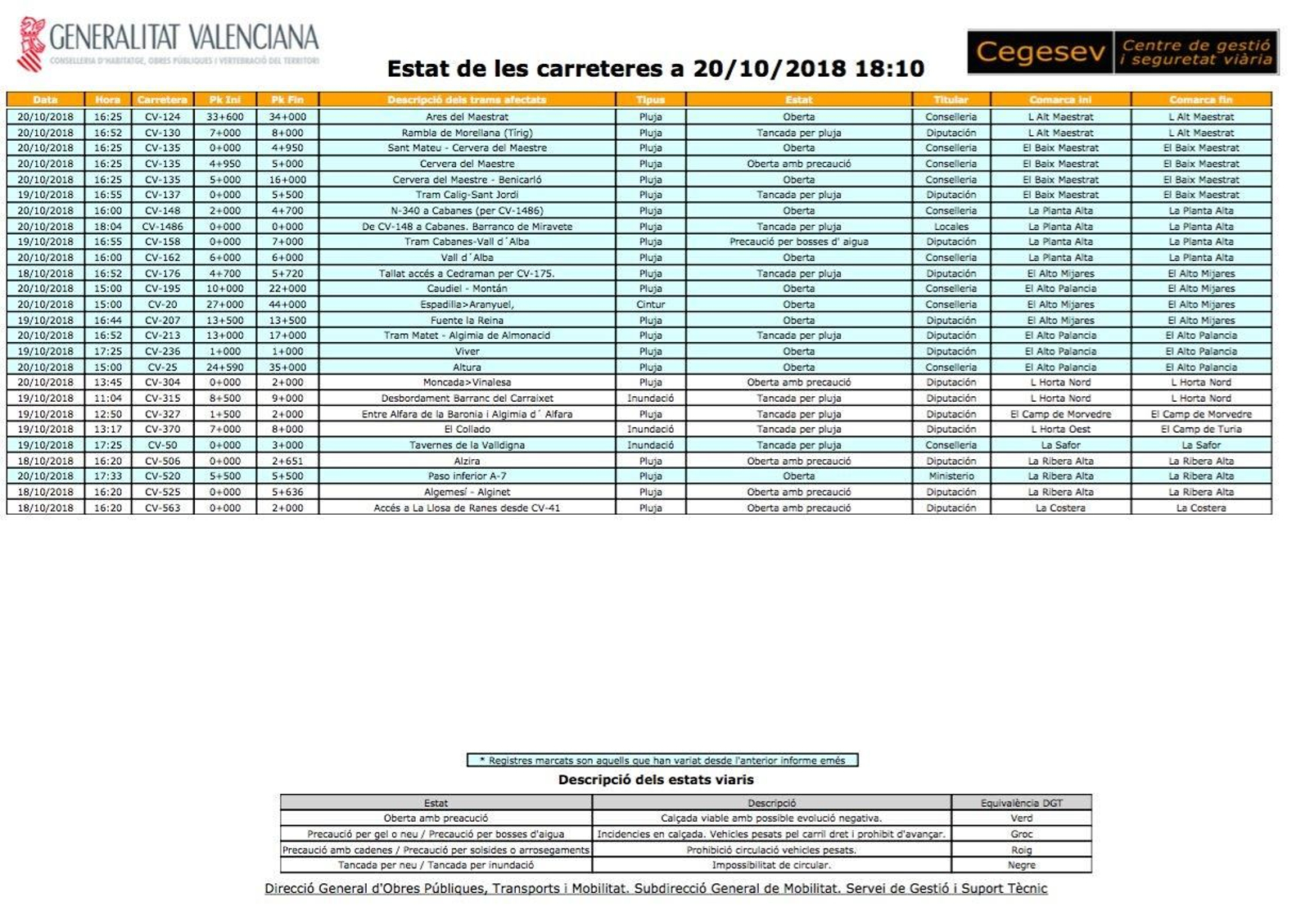 Segons informa la Direcció General de Trànsit (DGT) i l'Agència Valenciana d'Emergències amb dades actualitzades a les 18.10 de la vesprada, al Baix Maestrat continuen tallades la CV-137 entre Càlig i Sant Jordi; a la Plana Alta la CV-148 al barranc de Miravet i la CV-158 entre Cabanes i la Vall d'Alba; a l’Alt Millars la CV-176 a l'encreuament amb la CV-175; i a l’Alt Palància, la CV-213 entre Algímia d’Almonesir i Matet.