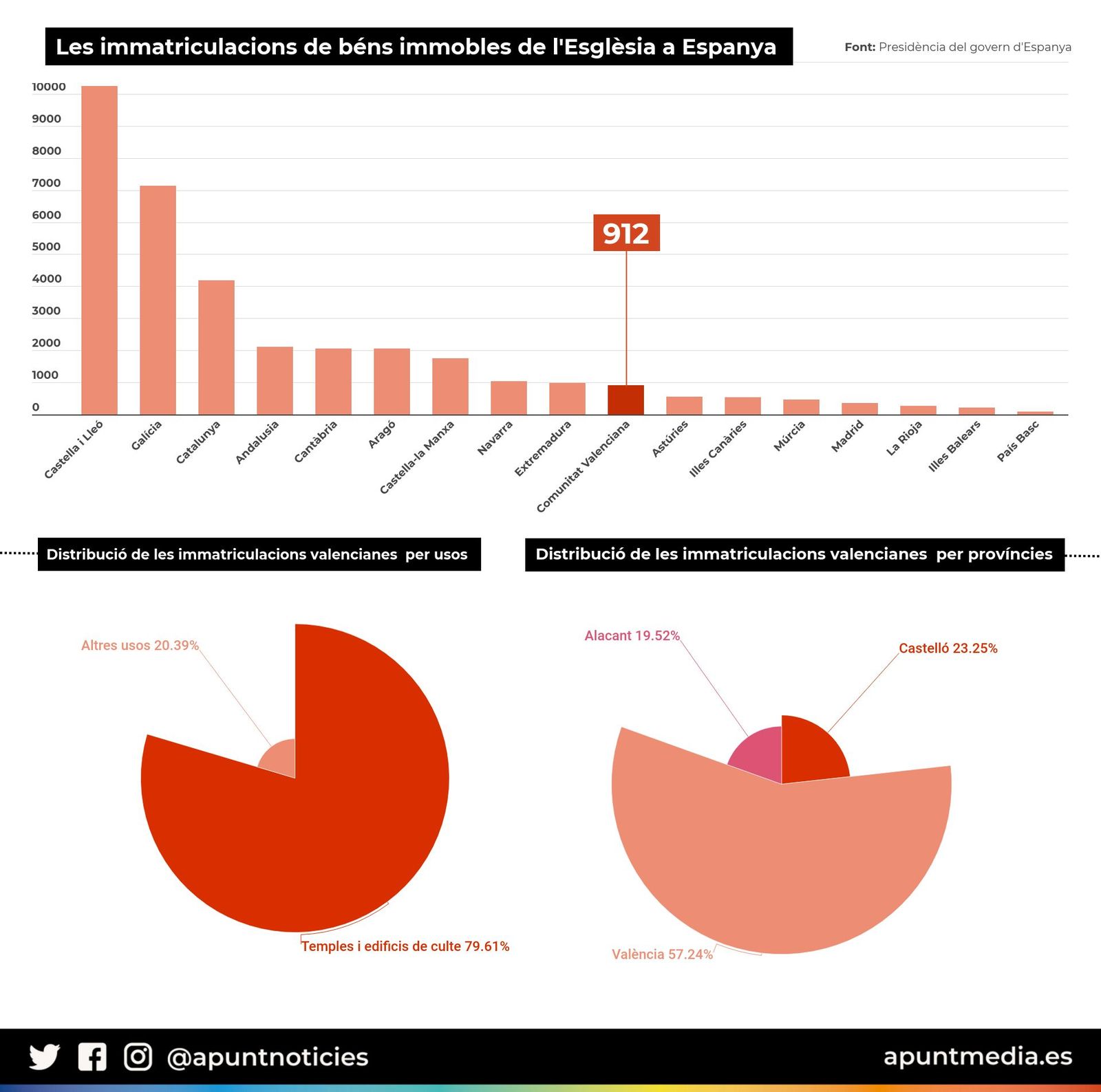 L'Església catòlica va inscriure al seu nom un total de 912 béns immobles entre els anys 1998 i 2015 a la Comunitat Valenciana, segons revela el llistat que ha remés aquest dimarts al Congrés el Consell de Ministres. La xifra representa només un 2,6% de les més de 34.000 propietats de què es va apropiar a tot Espanya acollint-se a la reforma de la llei hipotecària de l’executiu presidit per José María Aznar, derogada en 2015. Algunes de les propietats que va immatricular són monuments emblemàtics, com ara la mesquita de Còrdova, un dels més visitats del país. En terminologia registral, immatricular és ‘posar a nom d’una persona jurídica una propietat que no pertany a ningú emparant-se en la llei’.