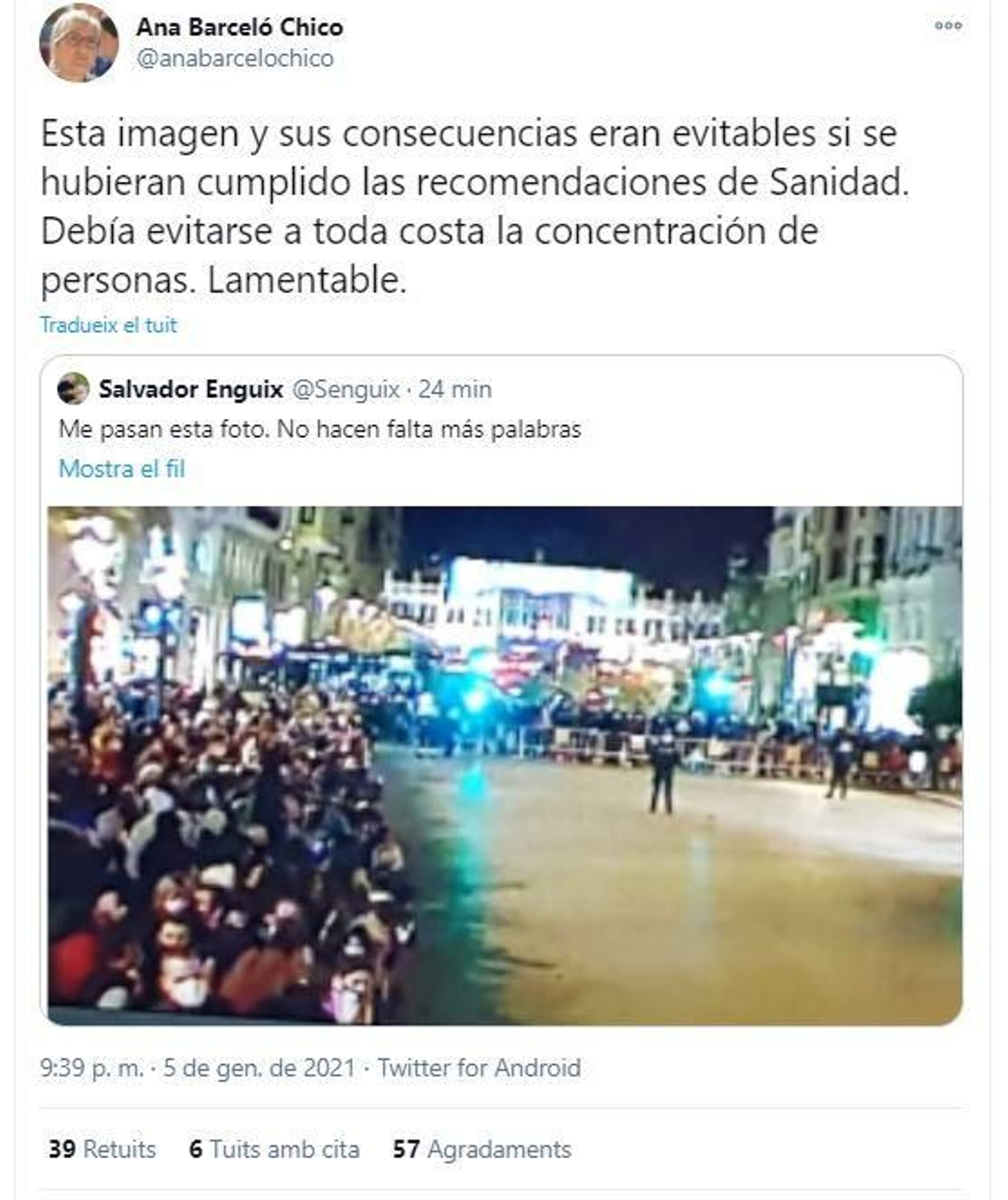 La consellera de Sanitat Universal Ana Barceló ha qualificat com “lamentable” la imatge de les aglomeracions. A través del Twitter Barceló ha assenyalat que les imatges eren “evitables” si s’hagueren complit les recomanacions de Sanitat. “Havia d’evitar-se a tota costa la concentració de persones. Lamentable”, ha dit.