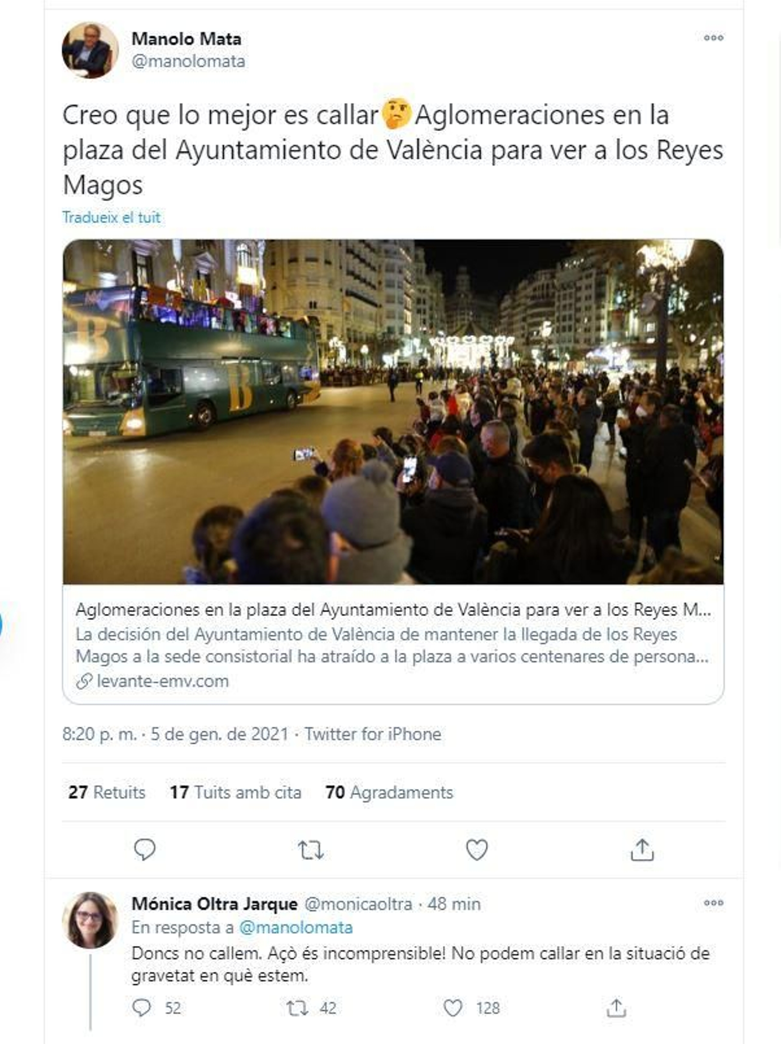 Les imatges hanprovocat altres reaccions polítiques a les xarxes socials. Al seu compte de Twitter elsíndic del PSPV a les Corts, Manolo Mata, ha dit “crec que el millor éscallar”. A la piulada de Mata ha respost la vicepresidenta del Consell MónicaOltra, qui ha dit: “Doncs no callem. Açò és incomprensible! No podem callar enla situació de gravetat en què estem”.