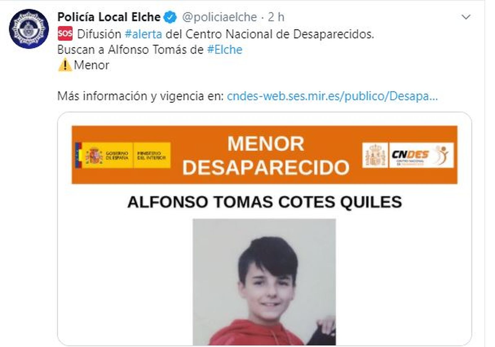 El Centre Nacional de Desapareguts, depenent del Ministeri de l'Interior, ha llançat una alerta per a tractar de trobar un menor d'Elx que està en parador desconegut des de divendres passat. Li diuen Tomás Cotes Quiles, té 15 anys i se li va pedre la pista el 14 d'agost a la capital del Baix Vinalopó.