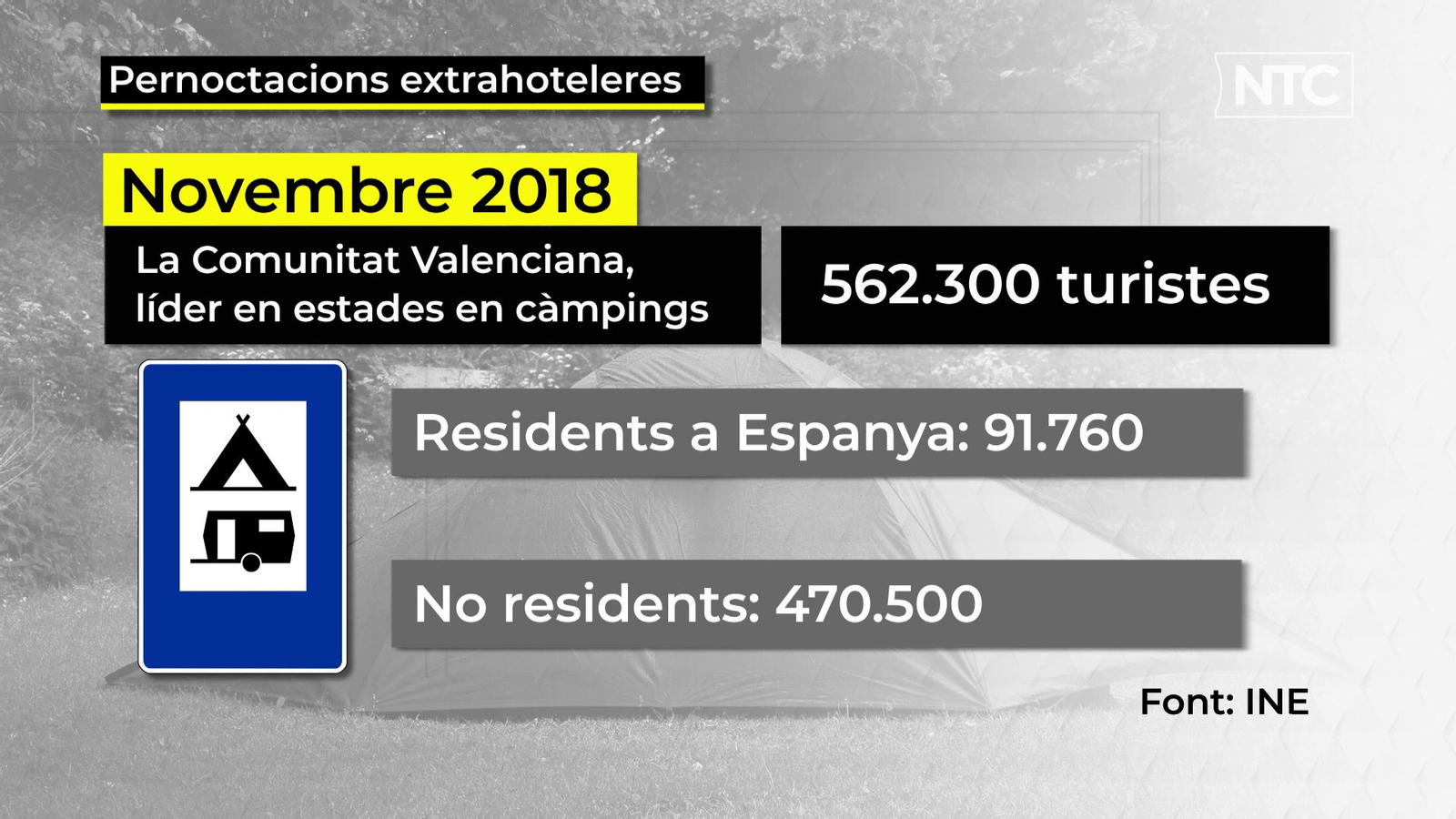 La Comunitat Valenciana ha sigut l'autonomia que més pernoctacions en càmpings va registrar el passat mes de novembre, segon un informe sobre allotjatments extrahotelers de l'Institut Nacional d'Estadística (INE). En concret, s'ha comptabilitzat la contractació de més de mig milió de nits (562.296), una xifra que representa un increment del 10% respecte a novembre de 2017.