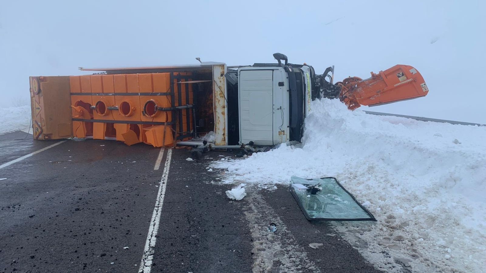 Una màquina llevaneu es travessa la carretera, després de volcar al port de Torre Miró, a l'N-233 / Ajuntament de Morella
