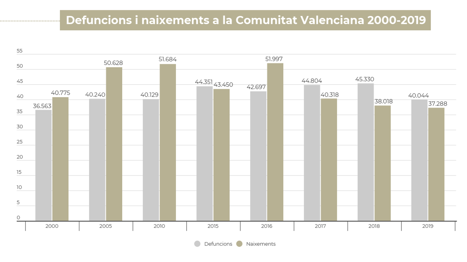 La natalitat cau a la Comunitat Valenciana per cinqué any consecutiu i al 2019 van nàixer 37.288 xiquets i xiquetes, un 1,5% menys que un any abans. També van morir 44.044 persones, el que suposa un 2,84% menys. Per tant, el saldo vegetatiu (naixements menys defuncions) és negatiu, ja que van morir 6.760 persones més de les que van nàixer.