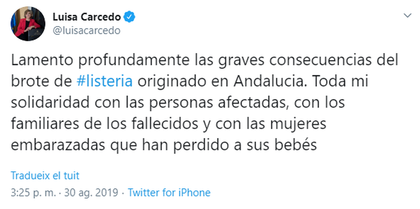 La ministra de Sanitat, Consum i Benestar Social, María Luisa Carcedo, ha volgut solidaritzar-se amb les víctimes del brot de listeriosi. En un comunicat publicat en xarxes socials, Carcedo ha dit que lamenta “profundament les greus conseqüències del brot de listeriosi originat a Andalusia”. Per aquest motiu, ha volgut insistir que envia tota la seua “solidaritat amb les persones afectades, amb els familiars dels morts i amb les dones embarassades que han perdut els seus bebés”.