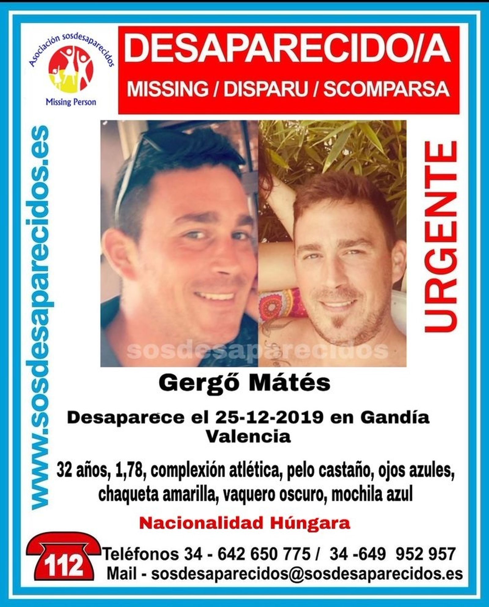 Un home de 32 anys està desaparegut a Gandia des del 25 de desembre, dia de Nadal. Li diuen Gergő Mátés i és de nacionalitat hongaresa. L'associació SOS Desaparegut ha llançat una alerta on demana col·laboració ciutadana per a localitzar-lo.