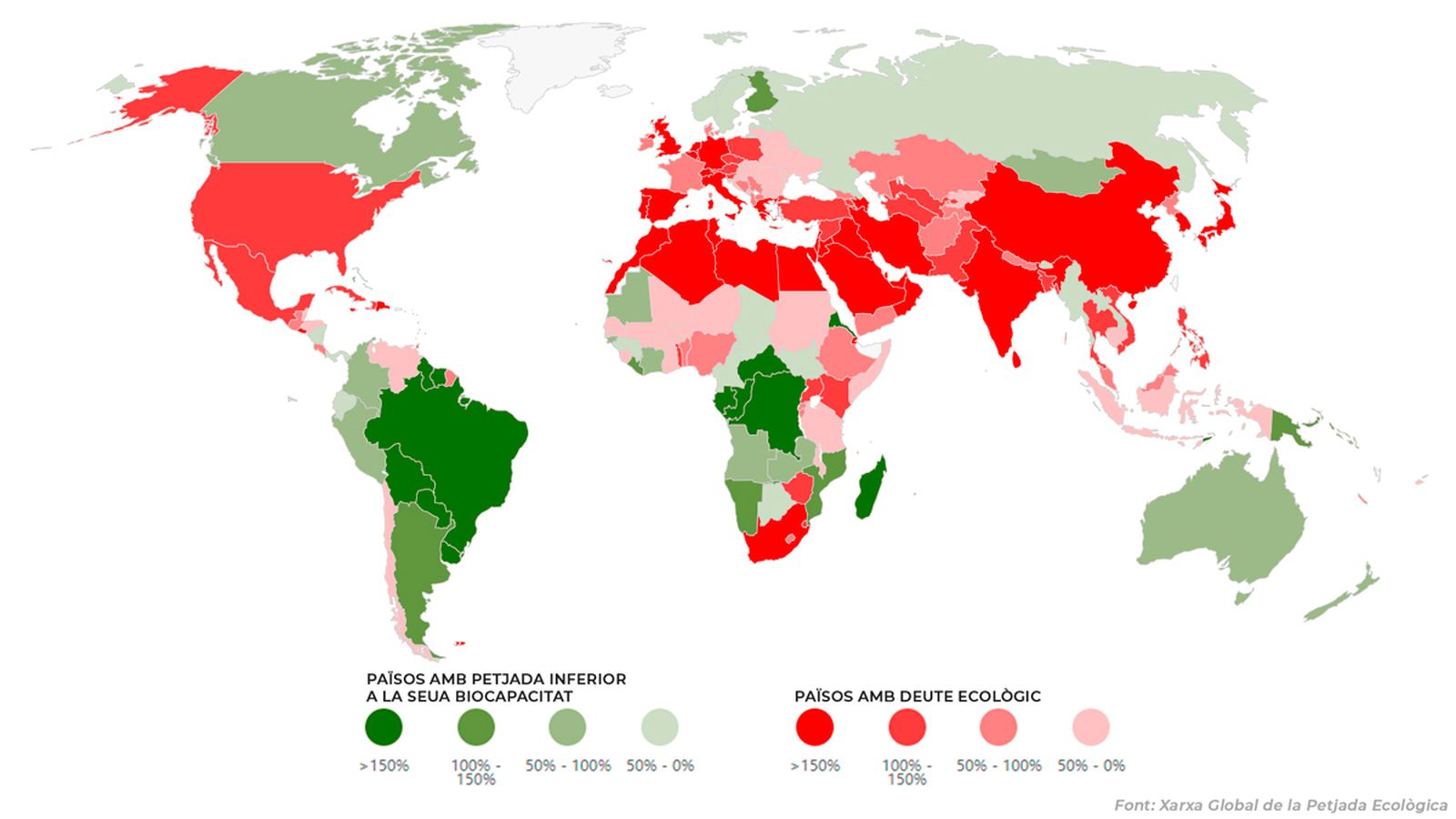 En roig, els països amb deute ecològic. En verd, els que tenen una petjada ecològica inferior a la seua biocapacitat / Xarxa Global de la Petjada Ecològica