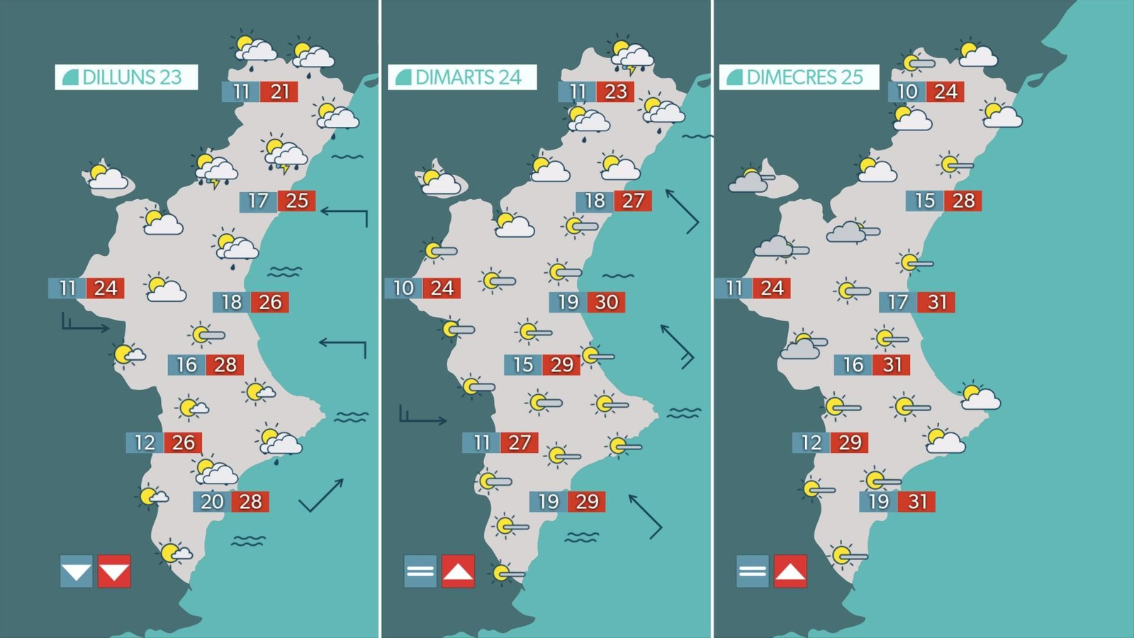 Dilluns repetirem la situació, amb intervals de núvols durant el matí i ruixats acompanyats de tempesta de vesprada al nord i en punts de muntanya d'Alacant, tot i que de forma més residual. Amb perspectiva de millora de cara a dimarts i dimecres, s'espera que des de dijous torne a augmentar la nuvolositat i també les temperatures.