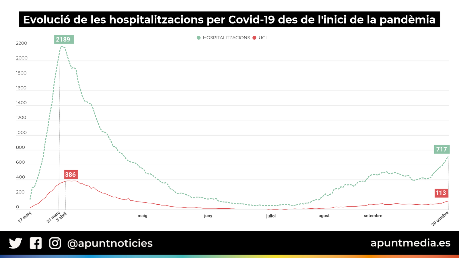 La situació en els hospitals valencians, tot i haver repuntat l'ocupació a l'octubre, tampoc és comparable a la de març i abril, quan es visqueren els moments més complicats. En el que portem de mes els ingressos s'han disparat un 80% i actualment hi ha 717 persones amb Covid-19 en centres hospitalaris. La xifra de pacients en UCI és de 113. Però són registres que estan molt lluny encara de les 2.189 persones que van arribar a albergar els centres sanitaris el passat 31 de març. Entre el 30 d'eixe mes i el 3 d'abril es va donar el pic màxim de saturació hospitalària. I eixe últim dia va registrar-se el pic d'ocupació en les UCI valencianes, amb 386 malalts en els llits. Tot i això, la tendència creixent dels últims dies ha posat en alerta les autoritats sanitàries.