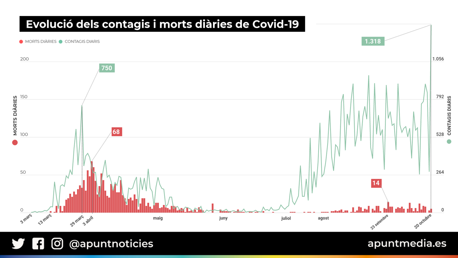 L'evolució de la corba de contagis en la segona onada, que comença a mitjans de juliol, està marcada per registres més alts que la primera, entre març i juny. El pic màxim de positius aleshores data del 29 de març, quan se'n comunicaren 750. Una quantitat superada puntualment a l'agost i diverses vegades al setembre. El mes passat, de fet, hi ha quatre dies en què es diagnosticaren més de 900 casos, tot i que mai s'havia superat la barrera del miler en les infeccions diàries fins aquest dimarts. La corba de la primera onada, en canvi, reflecteix increments més accentuats però no assoleix registres tan elevats. La inversió en detecció està probablement d'arrere d'aquest fet, ja que ara es practiquen moltes més proves diagnòstiques. Entre març i maig se’n feien 3.822 al dia de mitjana, mentre que entre l'agost i l'octubre la xifra es duplica i supera les 8.000.