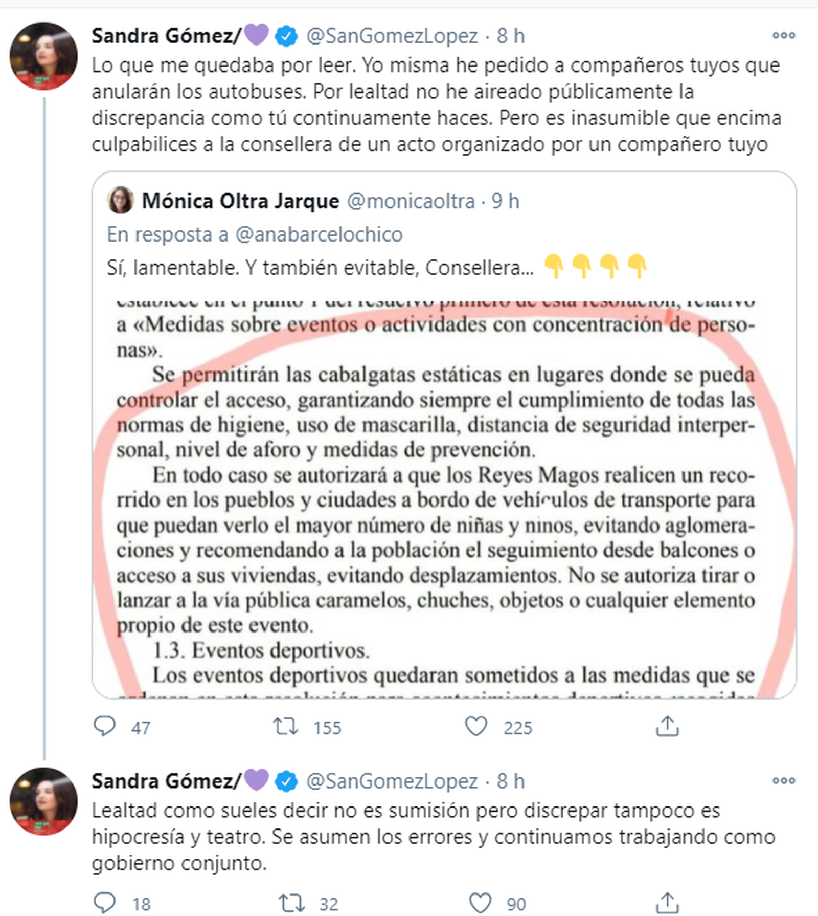 En l'encreuament intervenia també la vicealcaldessa de l'Ajuntament, la socialista Sandra Gómez, que no va dubtar a contestar les acusacions d'Oltra i assegurava que el PSPV de València havia demanat als socis en el govern local, Compromís, que anul·laren l'arribada de Ses Majestats en autobús. Li va retreure que culpe la consellera Barceló d'un acte organitzat per un company seu de partit.