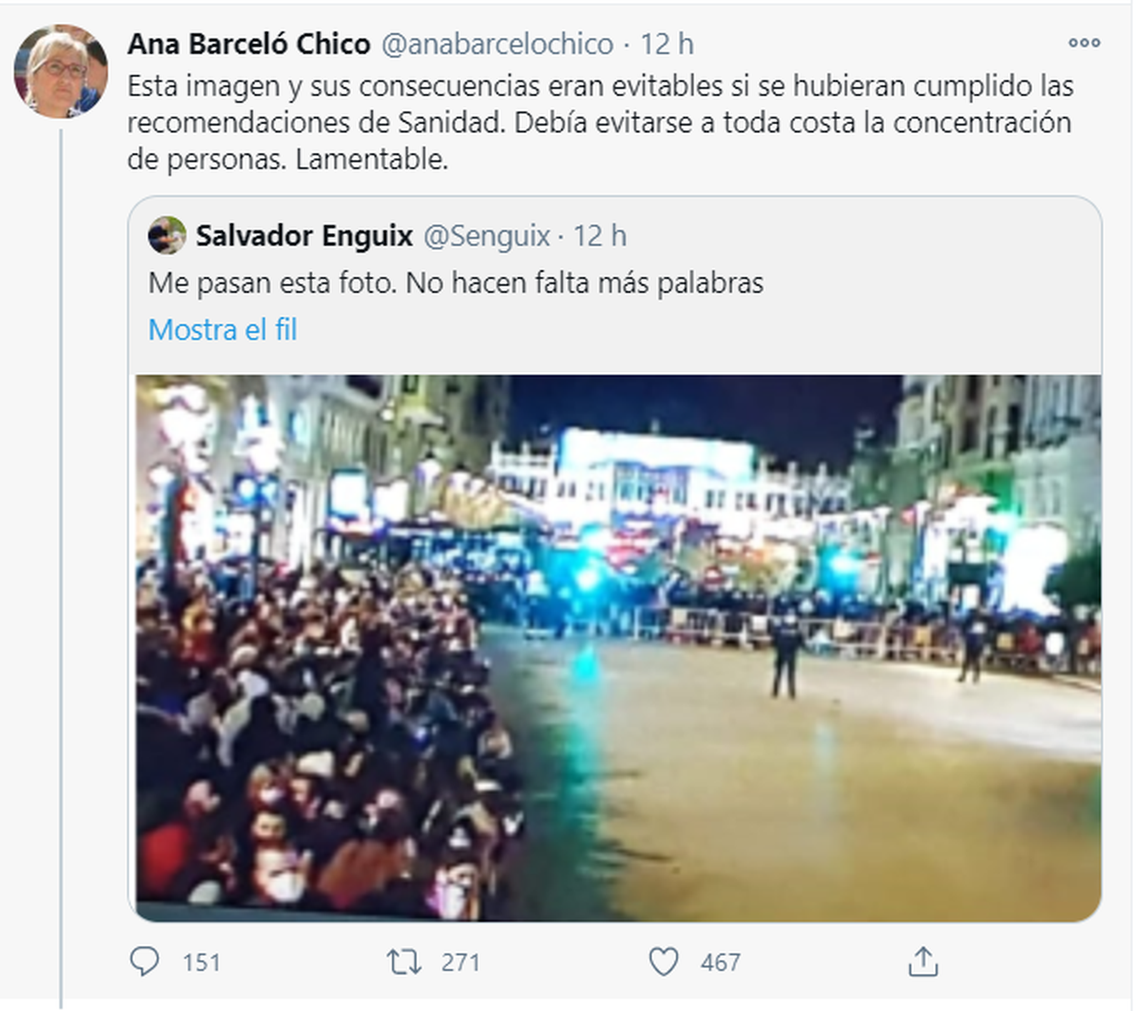 Barceló qualifica en Twitter de "lamentables" les aglomeracions i Oltra li retreu que Sanitat no prohibira totes les cavalcades.