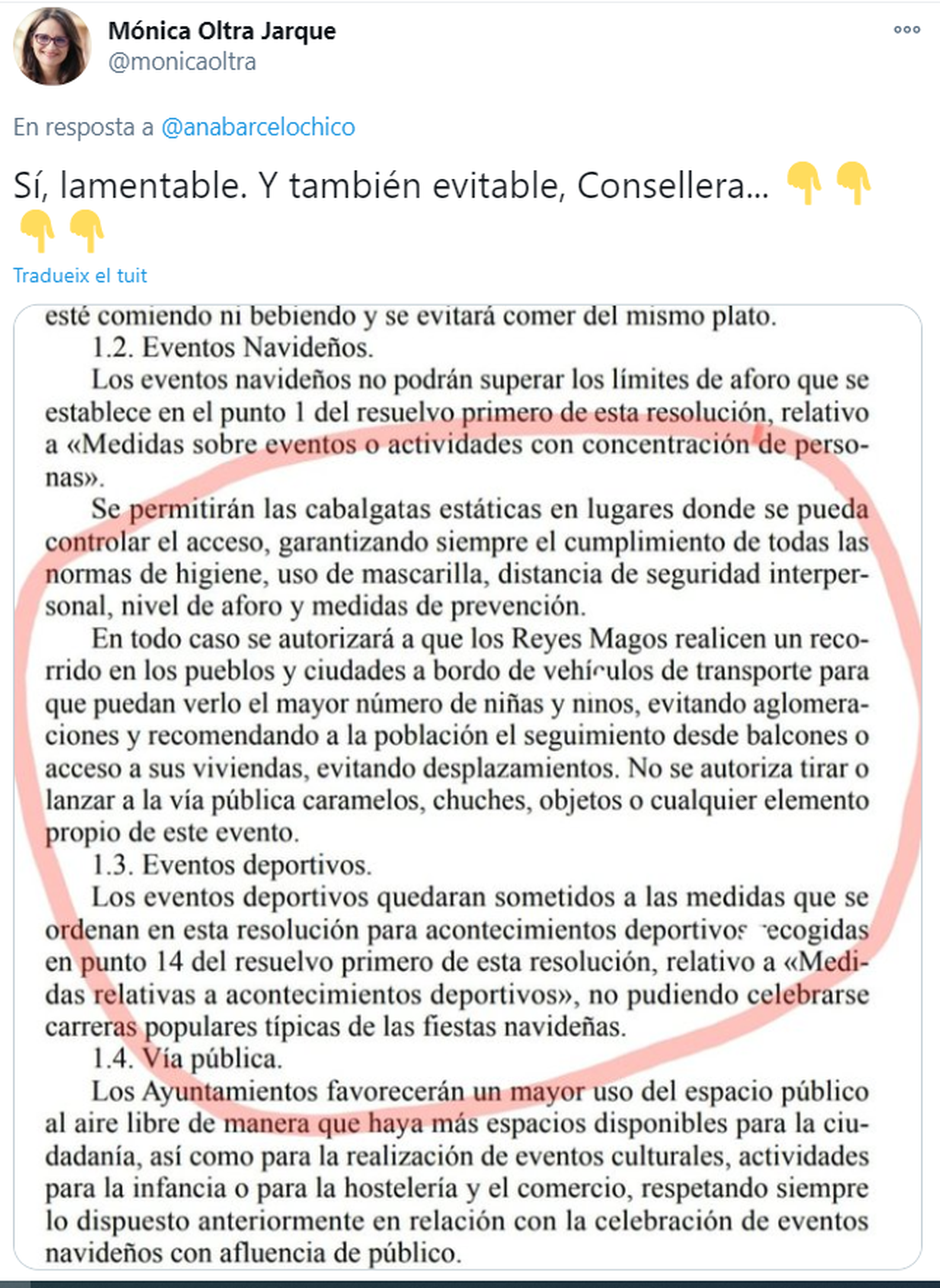 Junt amb el missatge, la vicepresidenta penjava una imatge amb un fragment del decret de mesures extraordinàries aprovat pel Consell al desembre per a regular els esdeveniments nadalencs a la Comunitat Valenciana. I estableix: "Es permetran les cavalcades estàtiques en llocs on es puga controlar l’accés, garantint sempre el compliment de totes les normes d’higiene, ús de mascareta, distància de seguretat interpersonal, nivell d’aforament i mesures de prevenció". La norma també autoritza els Reis d'Orient a fer-ne el recorregut als pobles i ciutats en vehicles perquè puguen gaudir de la cavalcada el màxim nombre de xiquets i xiquetes. Prohibeix llançar a la via pública objectes i recomana, en tot cas, seguir la comitiva des dels balcons de les vivendes.