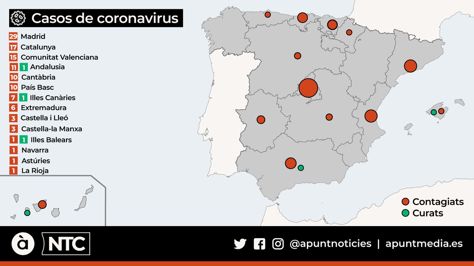A més dels nous contagis de Madrid, també s'han diagnosticat nou casos més a Cantàbria, cinc a Catalunya, tres al País Basc, dos a Castella-la Manxa, dos a Extremadura, altres dos a les Illes Canàries, 1 a Navarra i el primer cas a la Rioja.
