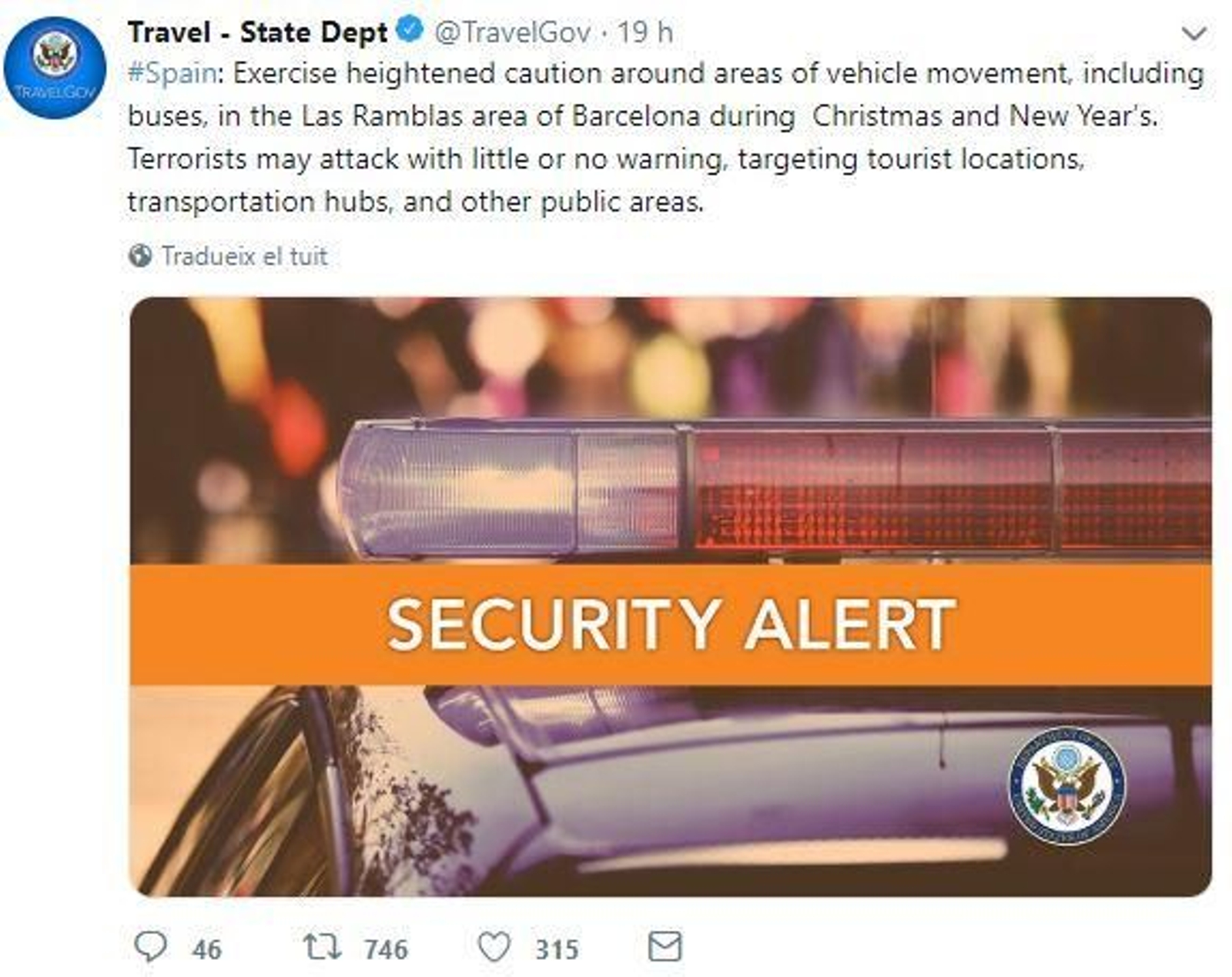 L'administració dels Estats Units alerta en el seu compte de Twitter els ciutadans nord-americans que passen les festes nadalenques a Barcelona que eviten La Rambla perquè hi ha risc que es produïsca un nou atemptat a la ciutat comtal.
