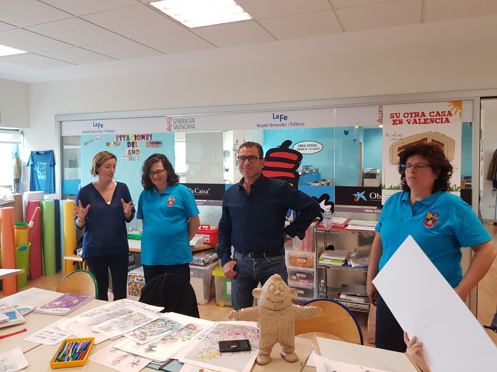 Com a part de la iniciativa, aquesta setmana alguns membres de la comissió i l'artista del monument gran, Pascual Nebot 'Pepi', han visitat la unitat pediàtrica de l'Hospital La Fe de València. Allí van explicar als menuts com es fa una falla i els regalaren un ninot. "Va ser una experiència que no es pot explicar en paraules", ens explica el també president de la falla Barri d'Onda, Sergio Navarro. "Vam eixir contentíssims en veure les sues caretes i la il·lusió amb què preguntaven".
