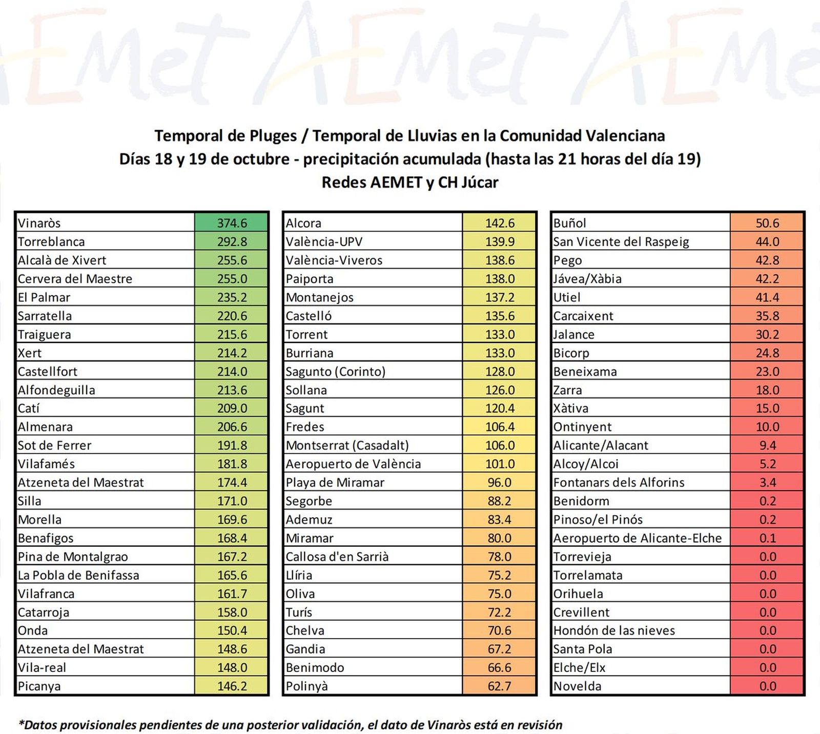 22.15 h. Actualització de les precipitacions fins a les 22:00 h. Les principals acumulacions d'aigua s'han donat a Sueca (175 l/m²), el Perelló (168 l/m²), Almenara (164), l'Albufera (161), la Vall d'Uixó (153), Silla (147), Almussafes (135), Aín (125), València (108) i Xèrica (91).