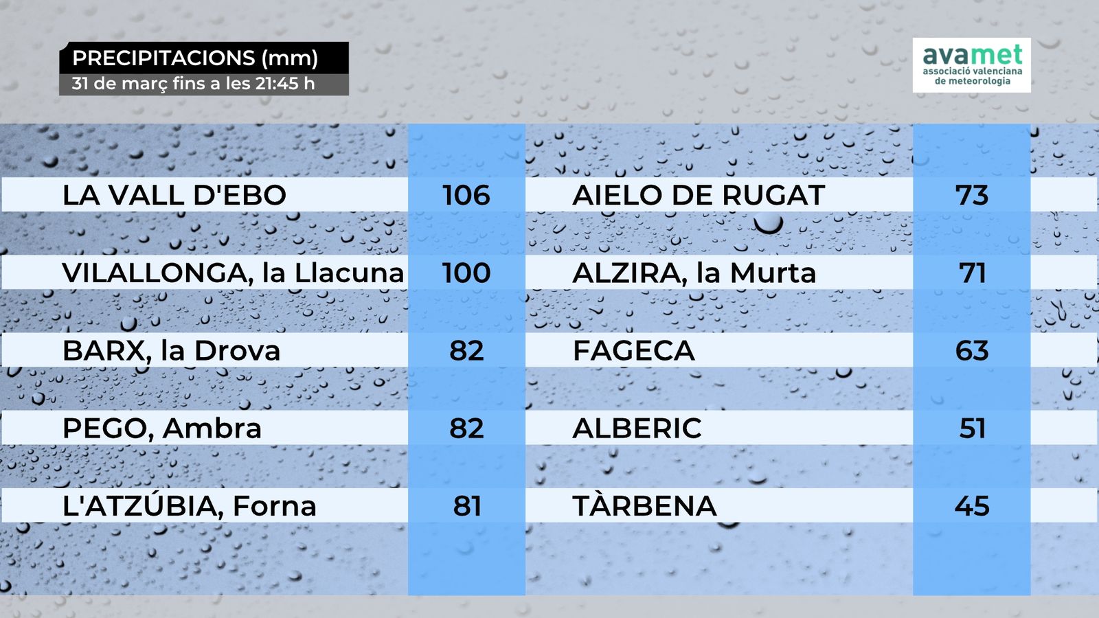 De moment, les pluges més importants s'han registrat a les comarques de la Marina Alta, la Safor, la Ribera Alta, la Vall d'Albaida o el Comtat. En algunes zones, com a la Vall d'Ebo, ja s'han superat els 100 l/m².