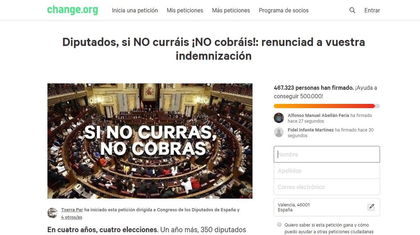 En Change.org es mouen diferents tipus d'iniciatives relacionades amb el 10N. Per exemple, una que demana als diputats i diputades que renuncien a la indemnització de transició, que comprén el període entre la disolució de les cambres fins a la celebració d'eleccions, una xifra que arriba als 9.273,74 euros bruts per a la majoria de circumscripcions. De moment, 222 dels 247 diputats que han perdut l'escó l'han demanada. La petició acumula prop de 500.000 signatures en la plataforma. L'etiqueta és "si no curres, no cobres".