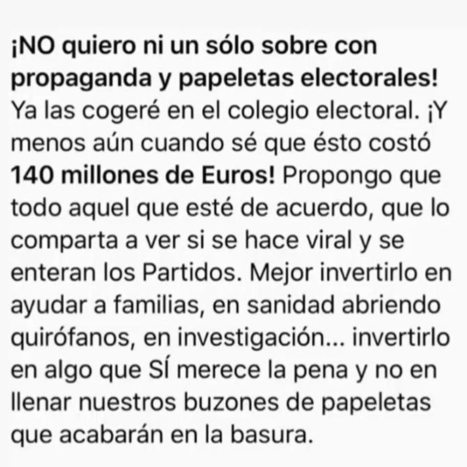 La proposta de rebutjar rebre propaganda electoral, una opció que permet l'Institut Nacional d'Estadística en el seu web, s'ha estés en les xarxes socials com la pólvora, fins al punt que el portal de l'INE es va col·lapsar per la quantitat de peticions rebudes. El següent missatge també s'ha fet ben popular en els grups de WhatsApp.