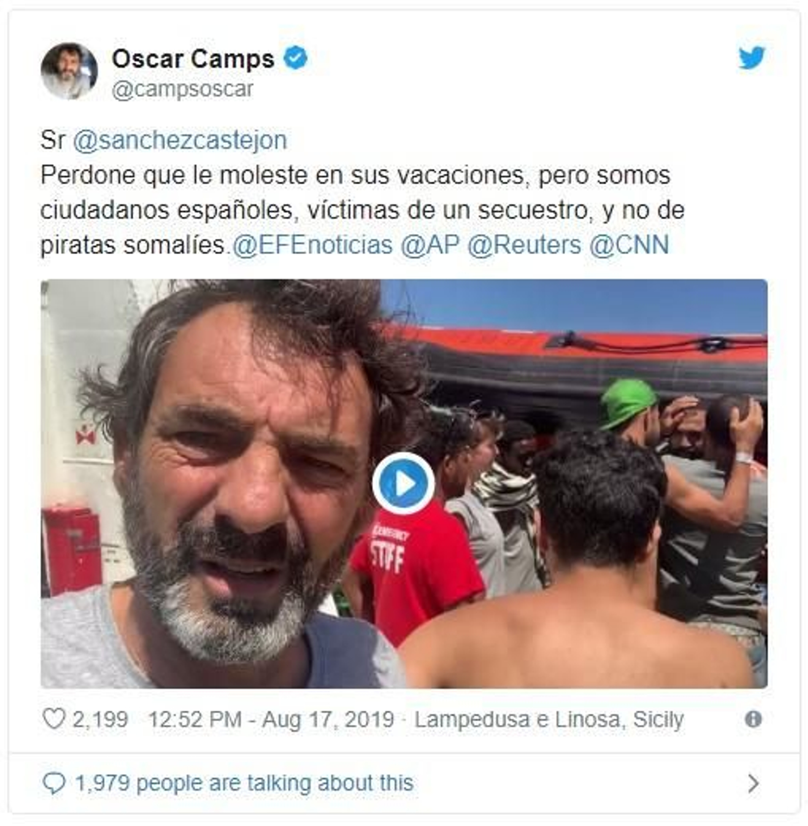 Des del seu perfil de Twitter, Òscar Camps ha interpel·lat el president del govern espanyol, Pedro Sánchez, denunciant la situació de tensió que es viu dins de l’embarcació i denunciant que es trobem retinguts en contra de la seua voluntat per un govern europeu, l’italià.